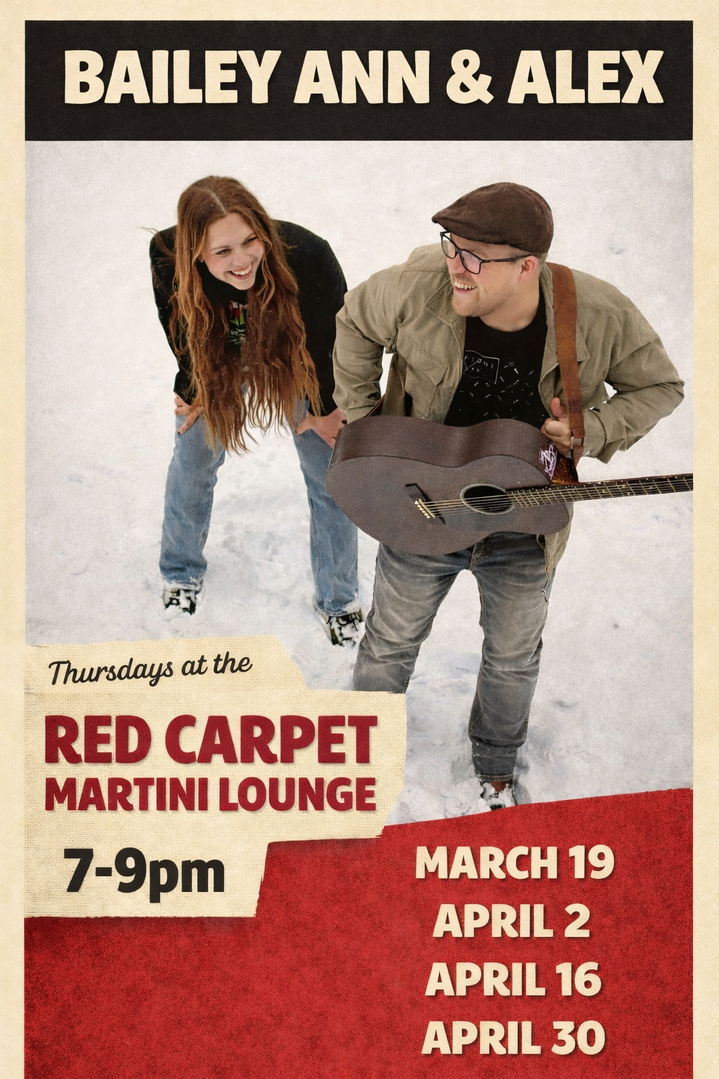 Join us Thursdays Nights in the Martini Lounge for Live Acoustic Night. Minnesota natives Bailey Eisinger and Alex Sutherland will be performing live in the Martini Lounge: March 19th // 7- 9 PM April 2nd // 7- 9 PM April 16th // 7-9 PM April 30th // 7-9 PM