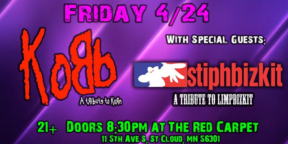 Back on the Mainstage Friday April 24th DOORS: 8:30 pm SHOW: 9 PM KoBb: Minnesota’s only tribute to KoЯn StiphBizkit - MN Tribute to Limp Bizkit